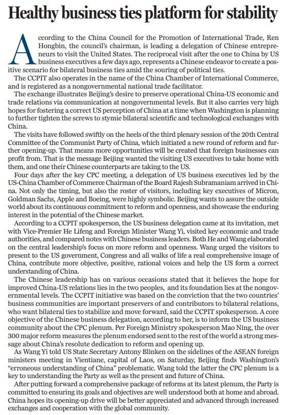 中国领导人多次表示,中美关系的希望在人民,基础在民间。贸促会发言人表示,无论是中国企业还是美国企业,都与两国关系的冷暖起伏休戚相关,也无一例外的希望积极推动两国关系稳下来、跑起来、向前走。该发言人还表示,中国企业代表团此次访美的主要任务,是把三中全会确定的一系列重要开放新举措传递给美国工商界。外交部发言人毛宁表示,全会通过的《决定》提出300多项重要改革举措,向世界释放了新时代中国坚定不移高举改革开放旗帜的强烈信号。