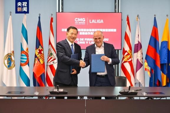 当地时间7月29日,中国中央广播电视总台与西班牙职业足球联盟(西甲)在马德里签署合作备忘录,双方就共同推动行业交流、联合举办赛事、助力青少年足球发展等方面达成一致。中宣部副部长、中央广播电视总台台长慎海雄与西班牙职业足球联盟主席特巴斯代表双方签约。