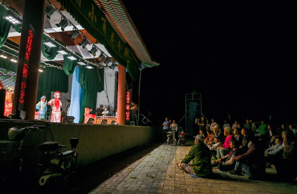 7月26日晚,当地邀请的晋剧曲艺团准备唱大戏,演员和工作人员们忙着化妆和整理戏台。