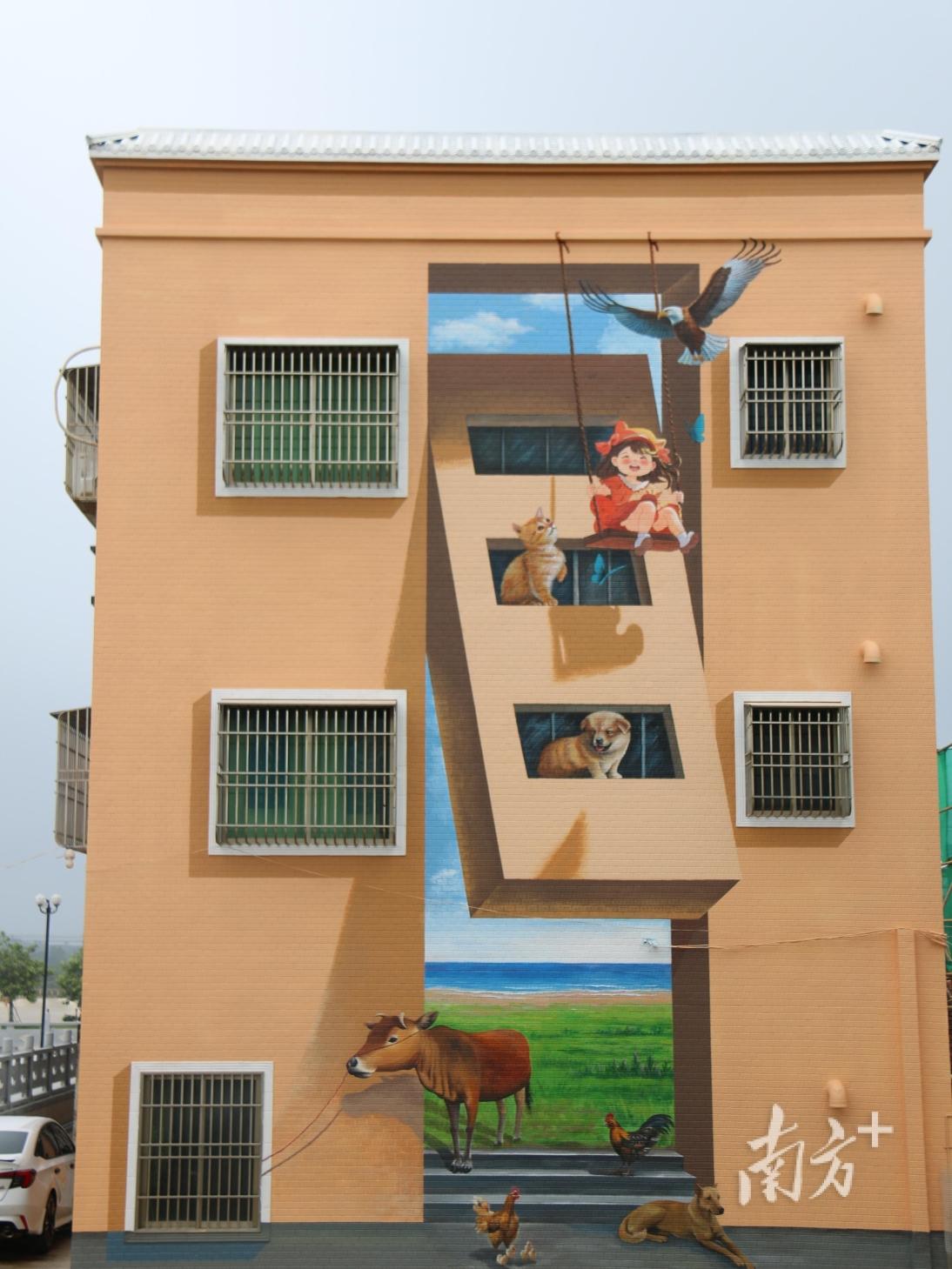 一名画家介绍,这幅墙绘的设计灵感源自他对童年乡村时光的怀念,并结合红海湾本地村庄面朝大海的景观,采用立体裸眼3D的形式进行创作,将纯真的乡村孩提时光还原在村民住宅上。