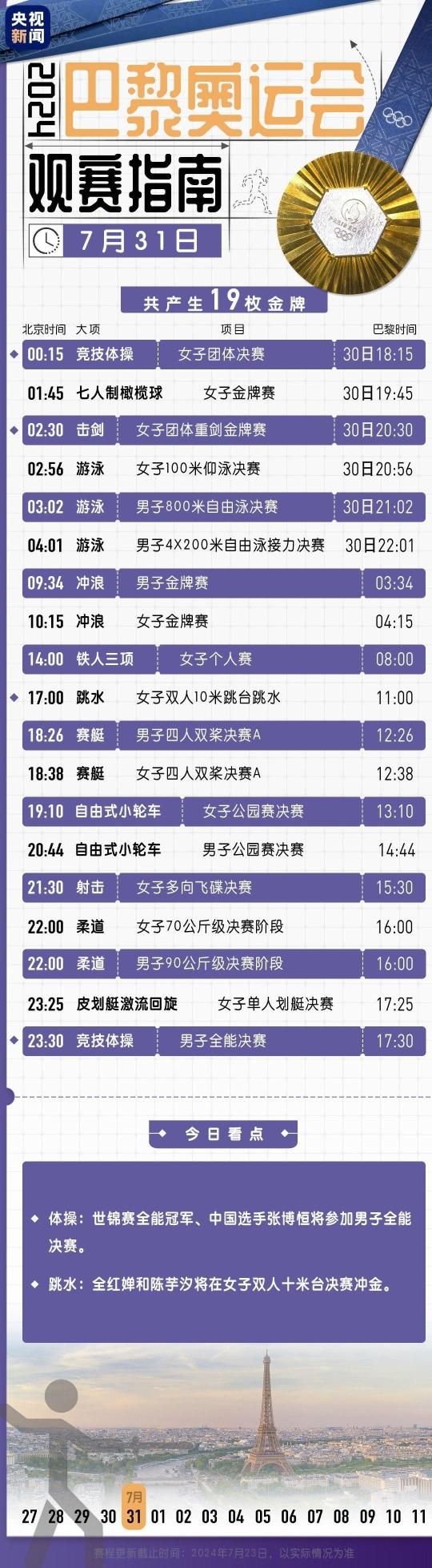 巴黎奥运会第五个比赛日将产生17枚金牌。中国体育代表团将在体操、跳水、游泳和赛艇等项目上冲击奖牌甚至金牌。