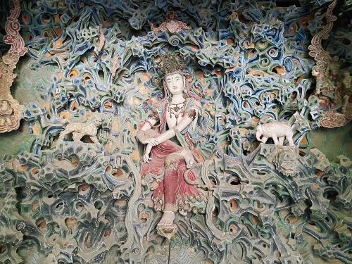 来到“京外名刹之首”隆兴寺。在集建筑、雕塑、壁画艺术于一身的摩尼殿内,被称作“东方美神”的倒坐观音,坐南朝北,体态松弛,神情闲适。多么富有人情味,你在哪个方向看她,她都能转睛看着你,欲和你交谈。