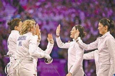 当地时间7月30日,中国体育代表团选手(右)赛后与波兰体育代表团选手击掌致意。新华社记者 张宏祥摄