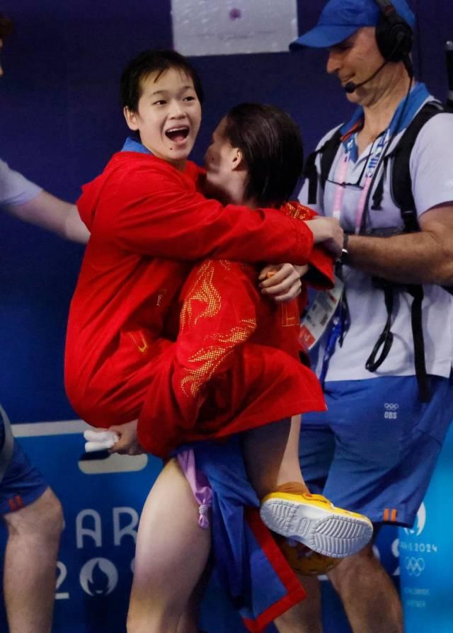 2024年7月31日,在巴黎奥运会跳水女子双人十米台决赛后,冠军中国选手陈芋汐/全红婵(左)庆祝胜利。图源:新华社