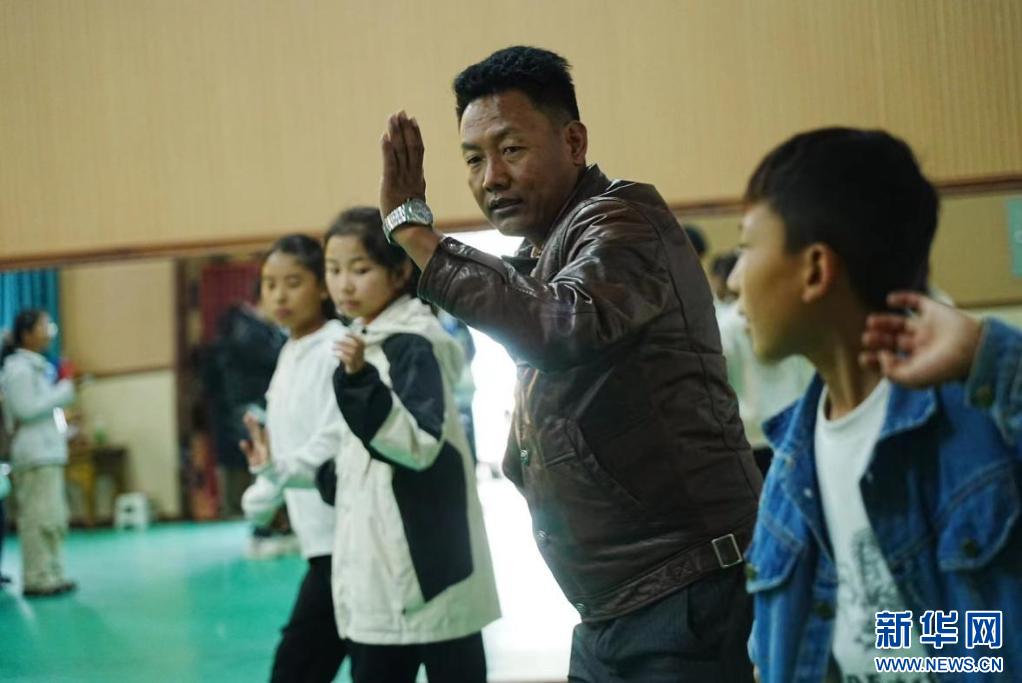 7月23日,洛桑扎西向小演员传授藏戏表演肢体动作。新华网发 姚翔硕 摄