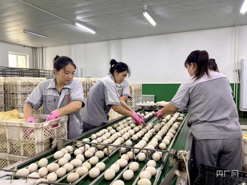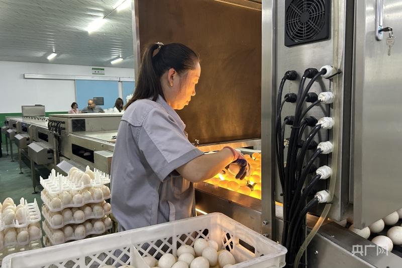 工人对种鸭蛋称重分级,再次挑选出合格种蛋进行孵化(央广网记者 李春雪 摄)