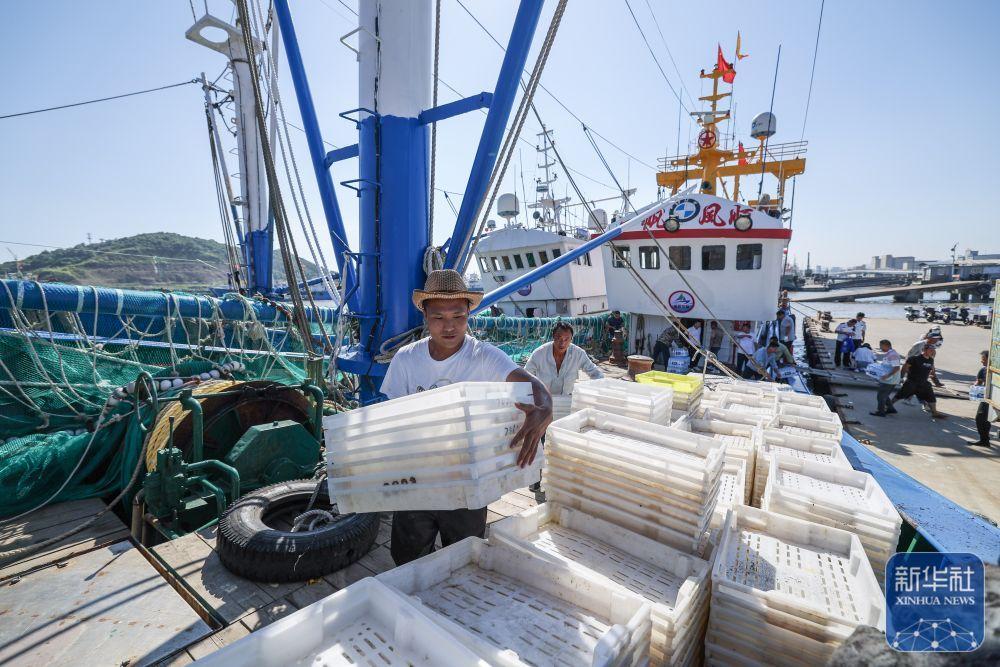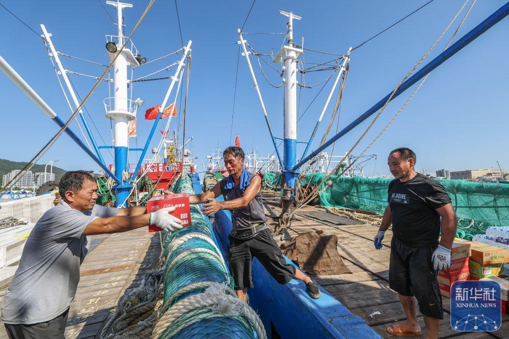 ↑7月31日,在舟山市普陀区沈家门渔港内,渔船上的渔民在搬运物资,准备开渔。