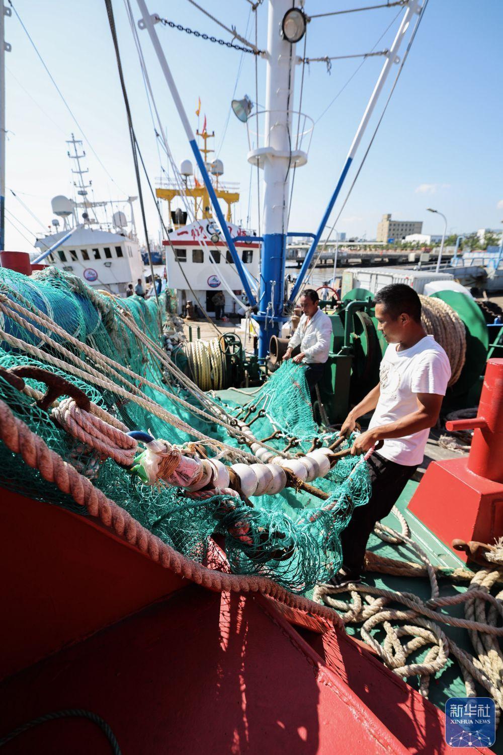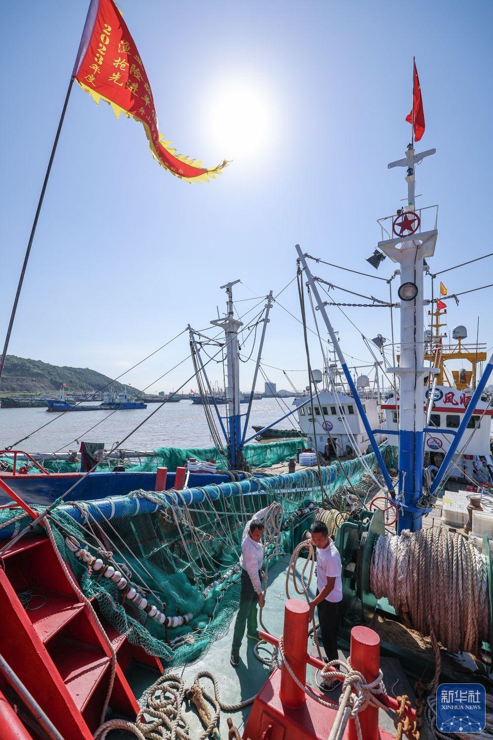 ↑7月31日,在舟山市普陀区沈家门渔港内,渔船上的渔民在整理渔网、绳索,准备开渔。