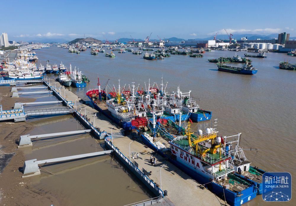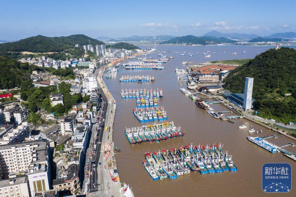 ↑7月31日,在舟山市普陀区沈家门渔港内,渔船静待开渔(无人机照片)。