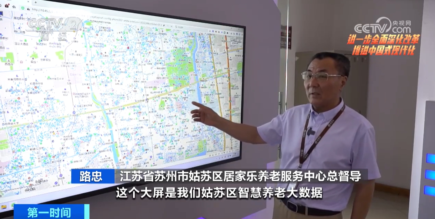 江苏苏州姑苏区居家乐养老服务中心总督导路忠介绍,这个大屏是姑苏区智慧养老大数据在线实时的数字地图,粉色的点就是现在正在服务中的284户老人,绿色的点位就是现在还有900多个老人在等待着上门服务,大量的蓝色的小点是服务用户,是整个“虚拟养老院”的老人。