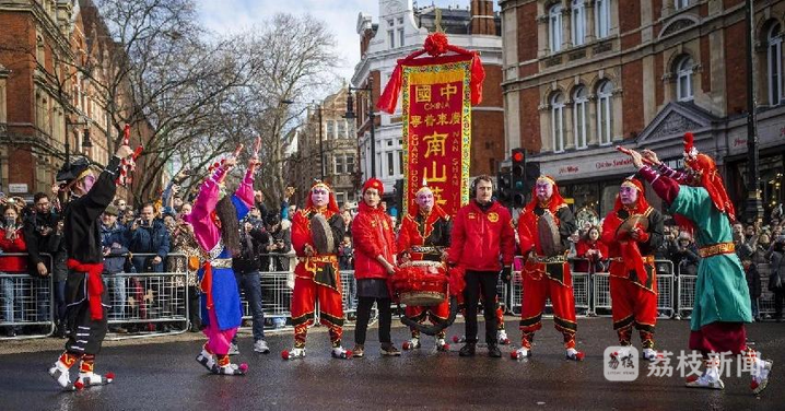 当地时间2024年2月11日,陈来发教练率领广东普宁南山英歌队的近20名舞者现身英国伦敦,揭开了当地新春庆典的帷幕,这也是普宁英歌首次出海。与此同时,千里之外的普宁市内另有一支南山英歌队伍正穿梭于街巷,为市民驱邪扶正,带队者之一正是陈扬波。