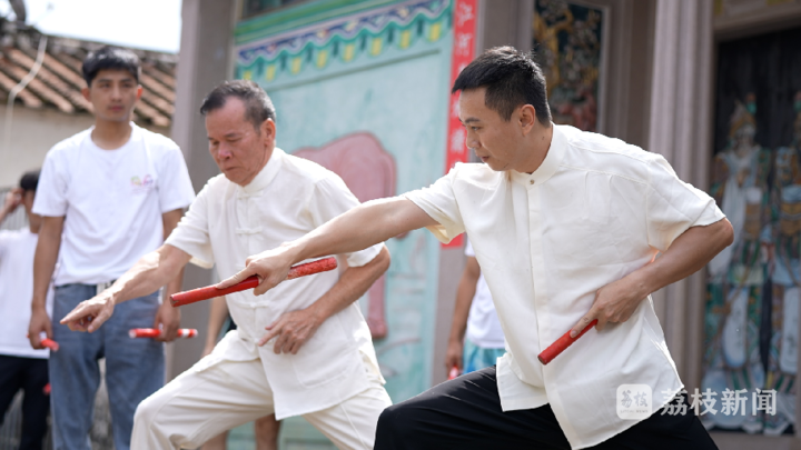 “耍槌花”是指舞者手握英歌槌中间部分,用手腕以八字绕动,同时中指、无名指、小指挑槌,使槌花形成立圆后连续转动,槌花打到哪里,眼睛就望向哪里。在这个过程中,英歌槌时不时就会打到手指,在陈扬波的记忆里,有好几次直到演出结束,才发现双手已沾满鲜血,但也只有使出这样的力道,才能把槌“耍出气势,耍得像盛开的花朵”。