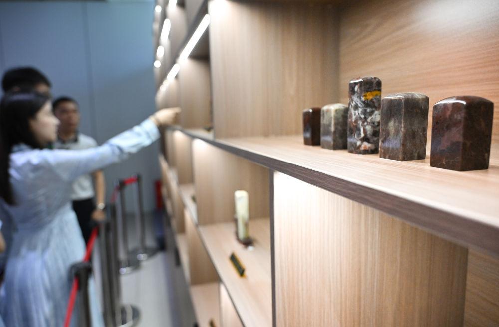 在浙江台州仙居县白塔镇上叶村仙居岩画艺术中心的展柜上摆放着用当地石材制作的印章文创品(7月28日摄)。新华社记者 李贺 摄