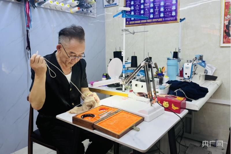 徐春元为顾客修补衣服(央广网记者 褚夫晴 摄)