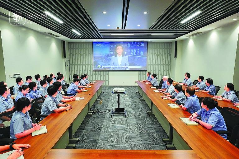 2024年8月1日晚,宁波永新光学股份有限公司员工集体观看央视《新闻联播》关于国家主席习近平给包陪庆、曹其镛等祖籍宁波的香港企业家回信的报道。潮新闻记者 贺元凯 彭鹏 周旭辉 摄