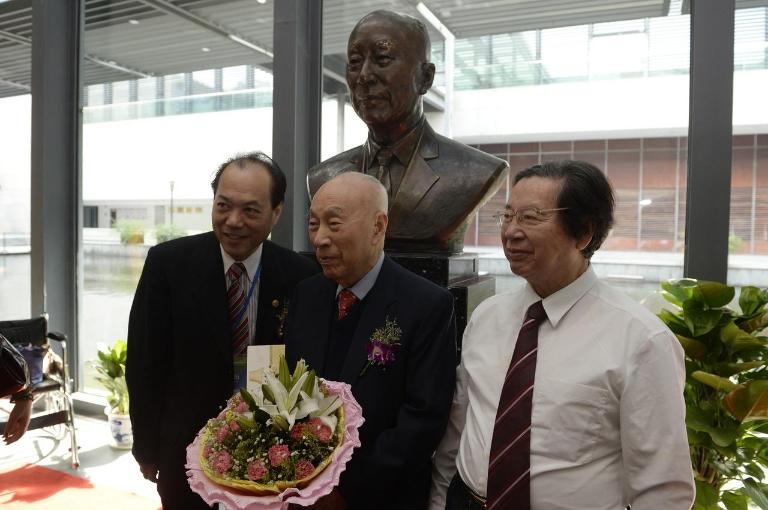 2014年7月31日,“宁波帮”代表人士李达三(中)在自己的塑像前留影。图片来源:新华社