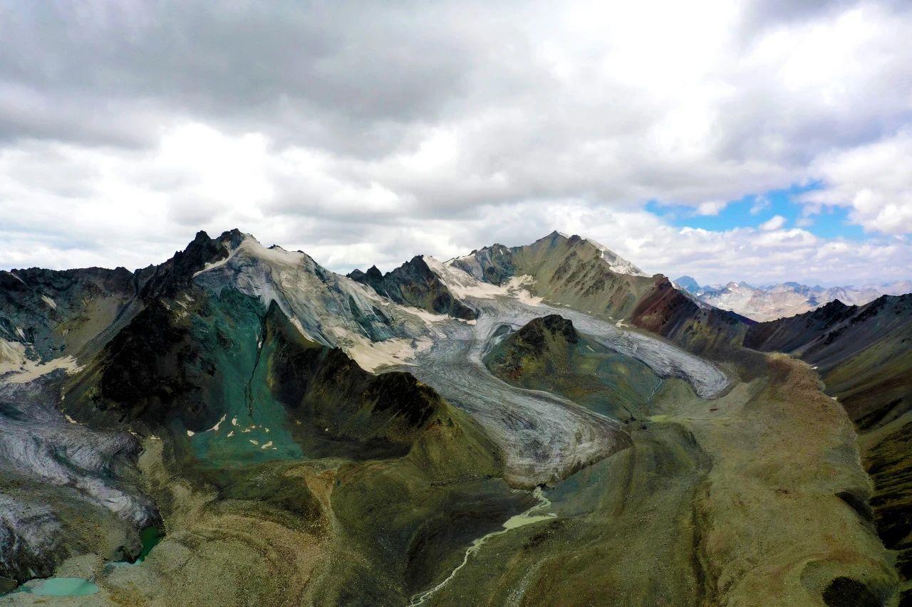 哈希勒根达坂是独库公路中南北疆的分水岭,从山顶垂悬下来的冰川一直延伸到公路边,紫红色的碎石山看上去非常壮观。