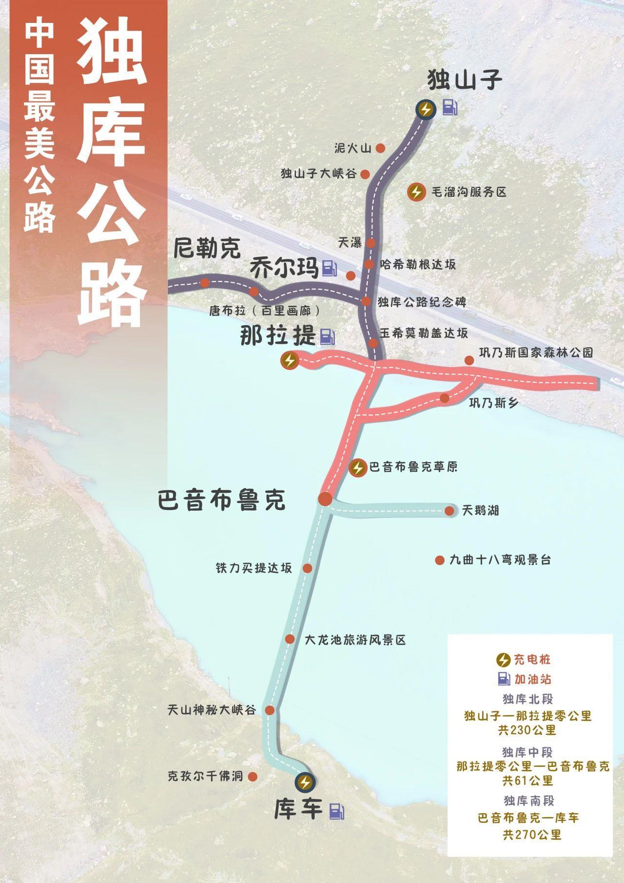 答:独山子零公里处、毛溜沟服务区那拉提服务区、巴音布鲁克自驾车营地、库车。