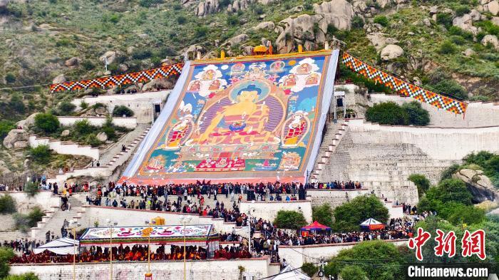 中新社拉萨8月4日电 法号声雄浑庄严,巨幅释迦牟尼唐卡在展佛台徐徐展开。8月4日是藏历六月三十日,哲蚌寺举行展佛活动,这是拉萨雪顿节最为重要的传统活动之一。