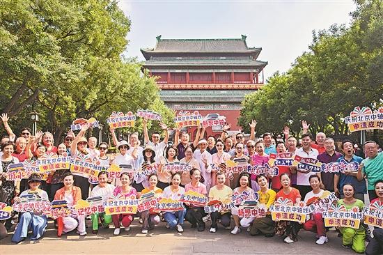 7月27日下午,众多市民来到北京中轴线上的钟鼓楼广场参加北京中轴线申遗成功快闪庆祝活动。记者 王伟伟 摄