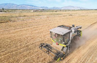 在新疆维吾尔自治区和硕县一处改良盐碱地里,大型机械在收割小麦。新华社记者 高晗摄