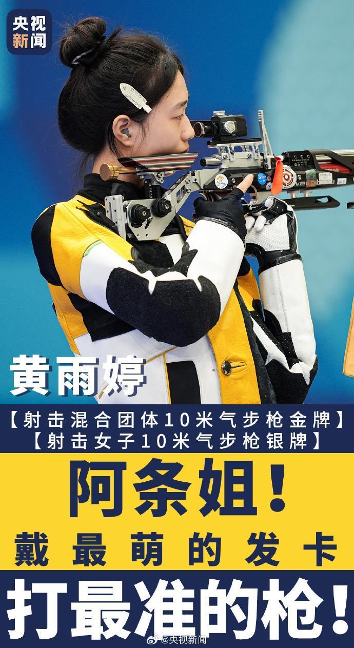 7月29日,在射击女子10米气步枪决赛中,“阿条姐”黄雨婷以0.1环之差获得银牌。