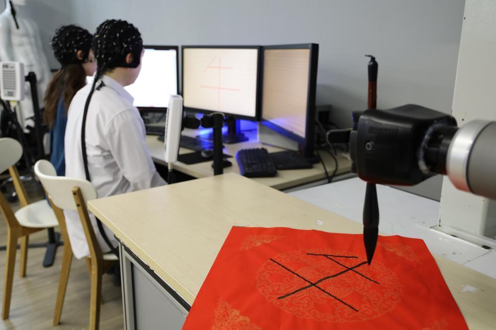 2021年2月2日,在天津大学医学工程与转化医学研究院的实验室内,操作者通过人脑“意念”操纵机械臂书写“牛”字。新华社记者 宋瑞 摄