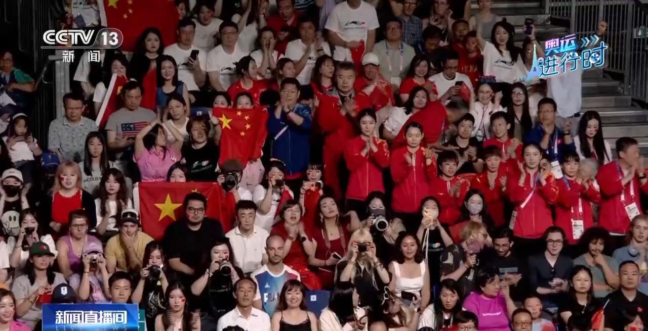 中国观众:看到全场都是中国红的时候,我已经分不清是在巴黎还是在北京,我们都为了祖国相聚在一起。特别是最后颁奖国旗升起来的时候,全场万人齐唱国歌,那一瞬间眼泪已经都下来了,真的为祖国自豪。