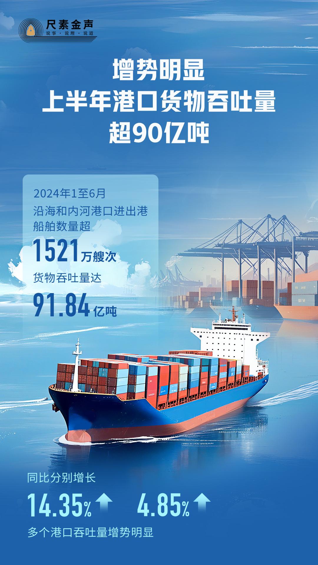 港口,货物进出口的重要门户;港口货物吞吐量,国民经济发展的“晴雨表”。日前,中国港口运行“半年报”公布:今年1至6月,沿海和内河港口进出港船舶数量超1521万艘次,货物吞吐量达91.84亿吨,同比分别增长14.35%、4.85%,多个港口吞吐量增势明显。