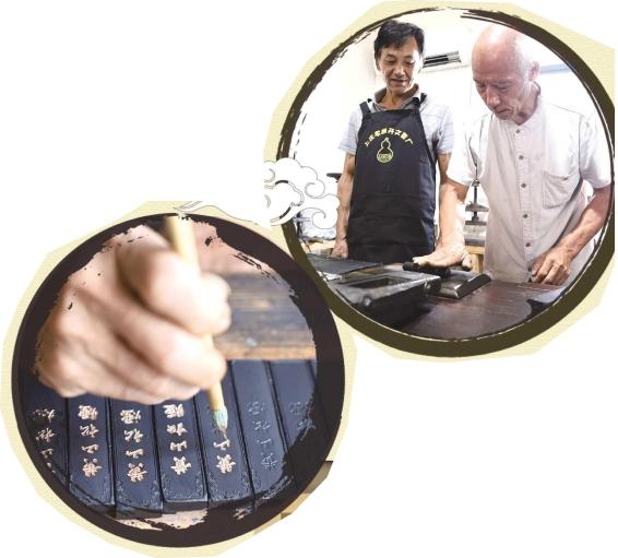 上图:7月24日,市级非物质文化遗产“徽墨制作技艺”代表性传承人胡嘉明在上庄镇的老胡开文墨厂指导员工徽墨古法技艺。下图:7月24日,市级非物质文化遗产“徽墨制作技艺”代表性传承人胡嘉明在上庄镇的老胡开文墨厂描金。