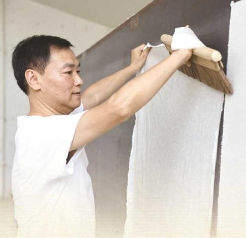 毛胜利介绍,“水深火热”是宣纸的两大关键环节。“水深”就是捞纸,“火热”则是晒纸。用竹篾编成的纸帘在浆水中捞提,两个捞纸工需要高度协调,才能保证每张纸的厚薄均匀。晒纸则是捞纸后的一道工序,先将架子上湿漉漉的宣纸揭下来,再将宣纸一张张分开,“晒”在加热的钢板焙面,最后用松针刷将纸慢慢刷平。2006年,宣纸制作技艺被列入首批国家级非遗。2009年,宣纸制作技艺被联合国教科文组织列入人类非物质文化遗产代表作名录。