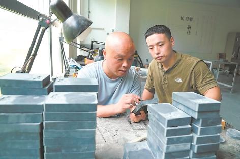 7月24日,宣城市非物质文化遗产宣砚制作技艺传承人黄瑞正在和宣城市工艺美术大师张明探讨礼品砚台的制作。