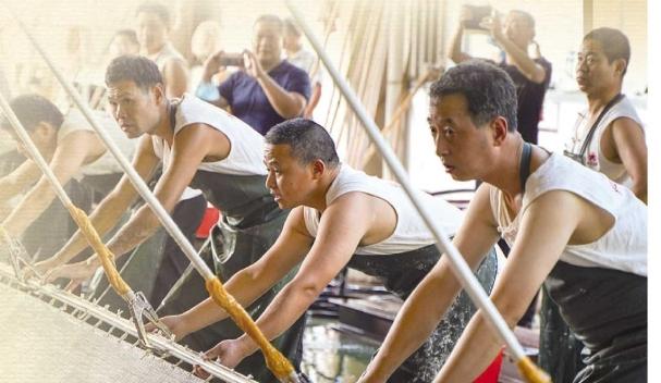 在“中国宣纸之乡”宣城泾县的中国宣纸股份有限公司三丈三“超级宣纸”生产车间里,44名技艺精湛的捞纸工匠齐心协力共同抬起巨型竹帘制作宣纸。