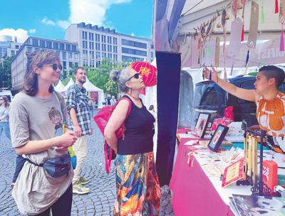 8月2日至4日,第四届法兰克福中国节在德国法兰克福市举行。图为当地市民和游客在欣赏中国手工艺品。记者 刘 赫摄