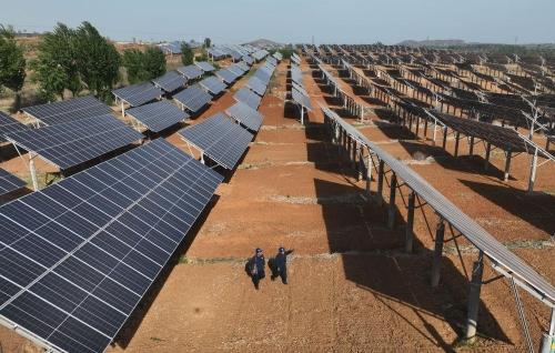 2024年4月16日,工人在河北省石家庄市灵寿县谭庄乡程家庄村的“农光互补”光伏发电场巡查(无人机照片)。新华社记者 杨世尧 摄
