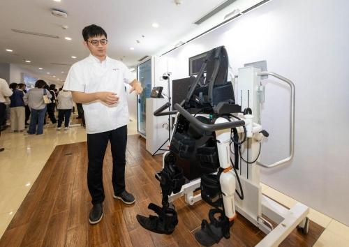 2024年5月24日,在位于上海市嘉定区的上海交通大学医学院附属瑞金医院肿瘤质子中心,工作人员介绍由瑞金医院医生和医疗公司共同研发的用于恢复患者下肢的医疗机器人。新华社记者 王翔 摄