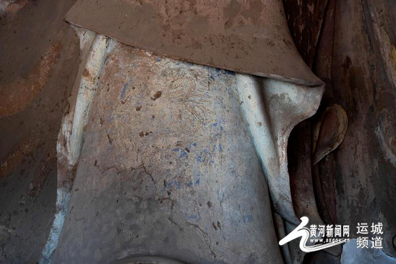 “这尊弥勒佛座像是依崖而雕的,高20米,宽6.8米,大佛的头部用的是泥塑,身部用的是土雕,两者完美结合,浑然天成。”崔锦倩讲解道,大佛最初身着彩绘,但岁月沧桑,大部分浮漆现已尽皆剥落,成为如今这般模样。