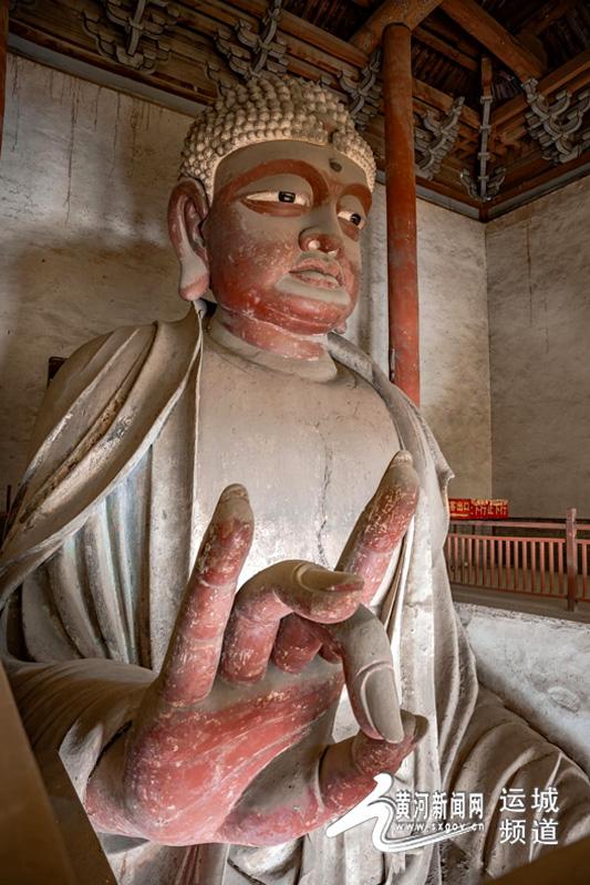 走近细看,佛像衣裙飘带的褶纹,被匠师们处理得疏密相间,宽窄有度;大佛的头饰密集罗鬓,鼻梁高挺,两眼端庄,神采奕奕;两只巨大的双耳垂在宽厚的双肩之上,嘴角则微翘着,流露出善意祥和的喜悦;他的左手下垂扶于左膝之上,右手上举呈“说法印”手的佛手状,双腿下垂,脚踏双莲,整个形体超凡脱俗,高大雄伟,使人一进殿中,便能感受到巨大的视觉冲击。
