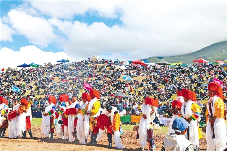 在边交林乡当杰村“望果节”活动现场,随着激昂的《运动员进行曲》,当杰村“平措林望果节”活动拉开帷幕,38名马术运动员、38名射箭运动员在2万多名观众的欢呼声中迈入现场。