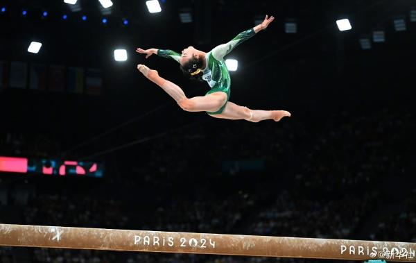 巴黎奥运会体操女子平衡木比赛中,中国选手周雅琴的靓丽身姿