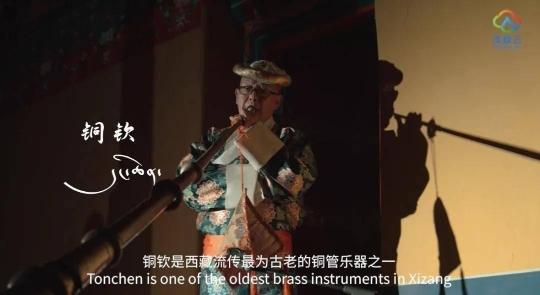 西藏自治区歌舞团演奏员 平措加拉:“铜钦是西藏流传最为古老的铜管乐器之一,因为是吹奏的形式,所以它的声量较长,可以吹奏三种调式,很多时候都和加林、鼓钹、苏呐一起进行演奏。它的历史很悠久,基本也有1600、1700年左右。它的声音非常雄浑,现在很多歌舞表演里也都会运用这个乐器。”