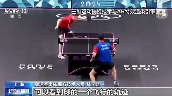 奥运赛事转播方技术人员 林奕廷:另外,我们在这次赛事当中可以看到其中一个效果,就是做一个实时轨迹的还原,可以看到球的一个飞行的轨迹,以及它在台面上的一个落点。那通过这样的一个轨迹,观众可以非常直观地看到这个球的一个速度感,包括力量感,去体现乒乓球这个赛事的一个精髓和魅力。