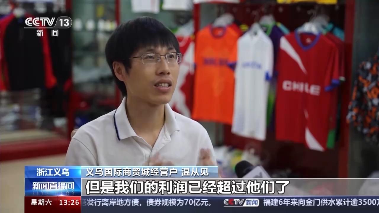 温从见是义乌国际商贸城的一位经营户,从事球衣服装行业已经17年,经历了多轮体育赛事的备货、生产和销售。得益于敏锐的反应力和良好的适应力,温从见在今年大赛期间收益颇丰。