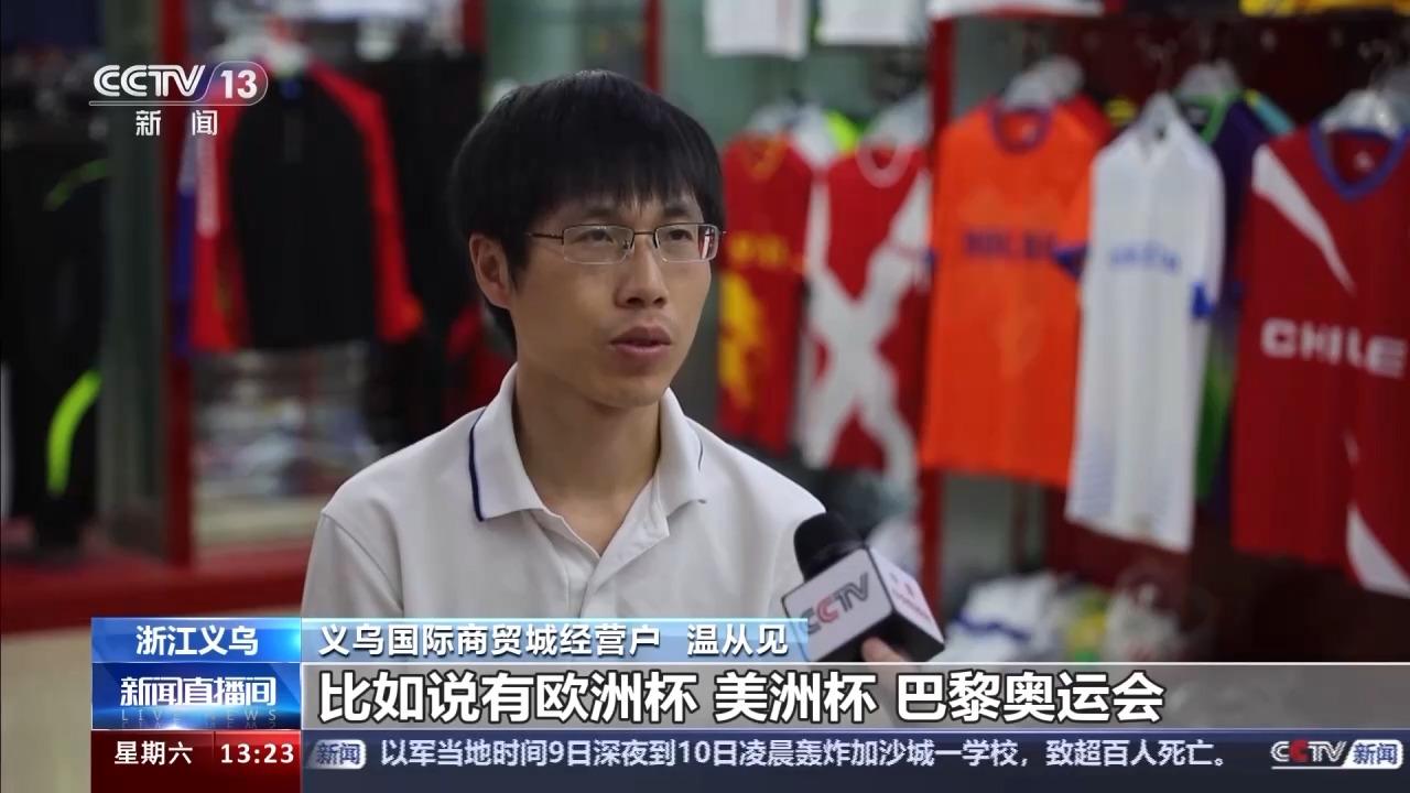 义乌国际商贸城经营户 温从见:今年因为是世界大赛年,比如说有欧洲杯、美洲杯、巴黎奥运会,差不多3月份开始,我们就已经着手开始接单、打样、生产这一系列的运动服饰。我们总共3个赛事下来销了30万件左右。