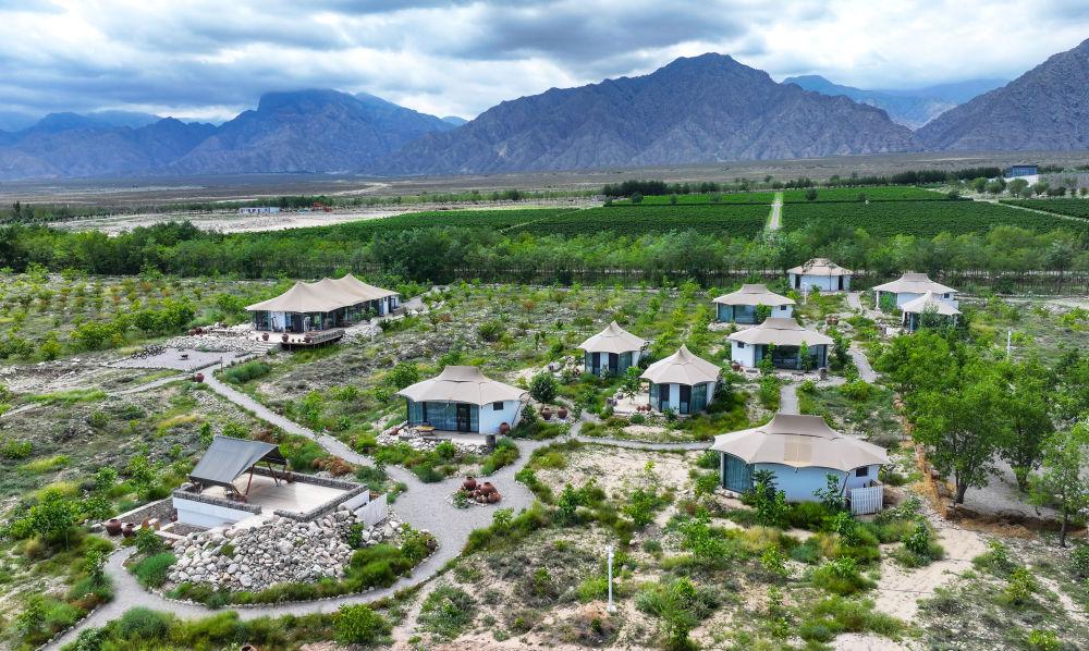 这是贺兰山下的“飞茑集×危须贺兰山游牧营地”(8月7日摄,无人机照片)。新华社记者冯开华 摄