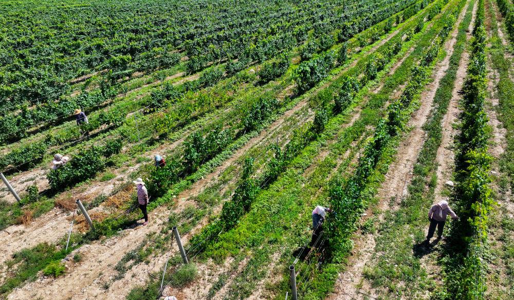 工人在贺兰山下的酿酒葡萄种植基地打理葡萄藤(8月7日摄,无人机照片)。新华社记者冯开华 摄