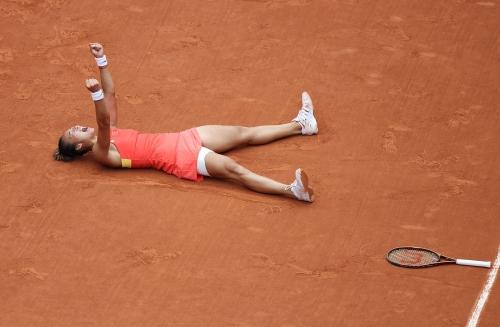 8月3日,郑钦文在巴黎奥运会网球女子单打金牌赛后庆祝夺冠。新华社记者 高静 摄