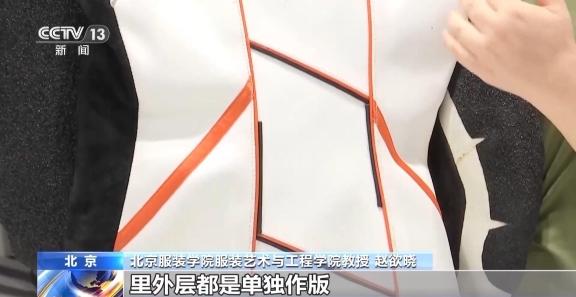 北京服装学院服装艺术与工程学院教授 赵欲晓:所有的衣片里外层都是单独作版。那么这一件衣服全套有六七十片样板,每片和每片都不一样。我们从外形上最明显的首先能看到就是两只袖子,它基本上是呈现了一种弯曲,跟射击姿态相近的一种形态。然后从衣身上我们可以看到一个扭曲的状态,是左低右高,也是和运动姿态相吻合的。