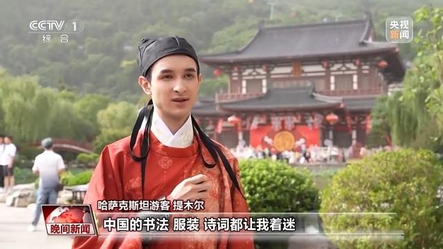 哈萨克斯坦游客提木尔:中国的书法、服装、诗词都让我着迷,今天穿着这身中国的传统服饰,体验中国唐代的宫廷婚礼,这个经历真的太独特,太珍贵了。