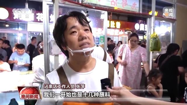 沾串店工作人员 张萍:干了到现在已经有十几年了,我们一开始也是十几种蘸料,每年都更新,都在增加中。一天卖个3000串左右,一天大概有30多壶酱料。
